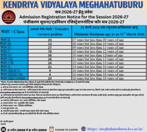 Kendriya Vidyalaya Meghahatuburu में शैक्षणिक सत्र 2026-27 के लिए नामांकन प्रक्रिया प्रारंभ कर दी गई है। विद्यालय द्वारा जारी अधिसूचना के अनुसार, यह प्रक्रिया 2 अप्रैल से 8 अप्रैल 2026 तक ऑफलाइन माध्यम से संचालित की जा रही है। पंजीकरण का समय प्रतिदिन सुबह 9:00 बजे से दोपहर 2:00 बजे तक निर्धारित किया गया है।