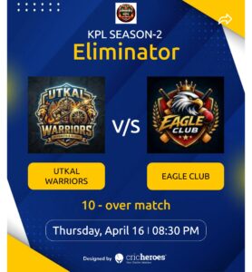 16 अप्रैल की शाम 6:30 बजे से बीएल जगुआर और जोहार एकादश के बीच क्वालीफायर-1 मुकाबला खेला जाएगा। वहीं रात 8:30 बजे से उत्कल वॉरियर्स और ईगल क्लब के बीच एलिमिनेटर मुकाबला होगा।