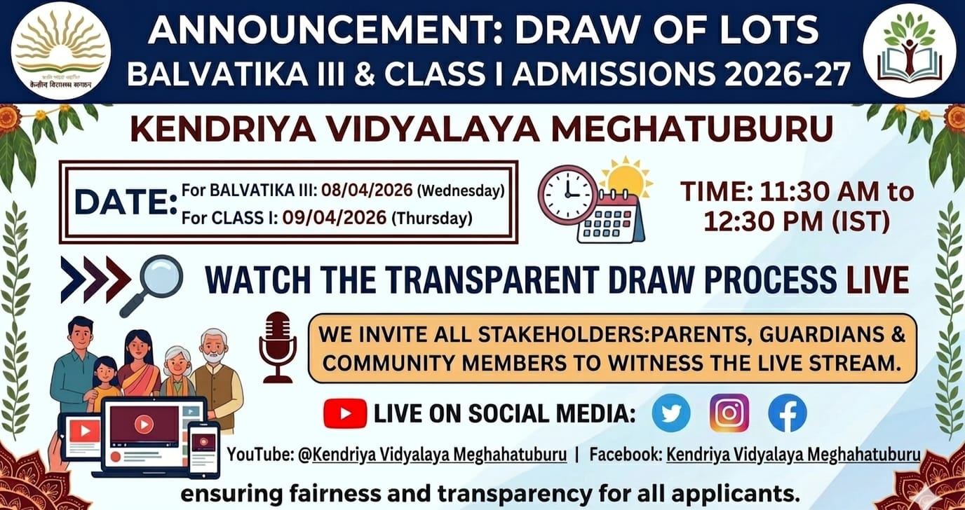 केन्द्रीय विद्यालय मेघाहातुबुरु में बालवाटिका-III व कक्षा-1 नामांकन हेतु लॉटरी 8 व 9 अप्रैल को